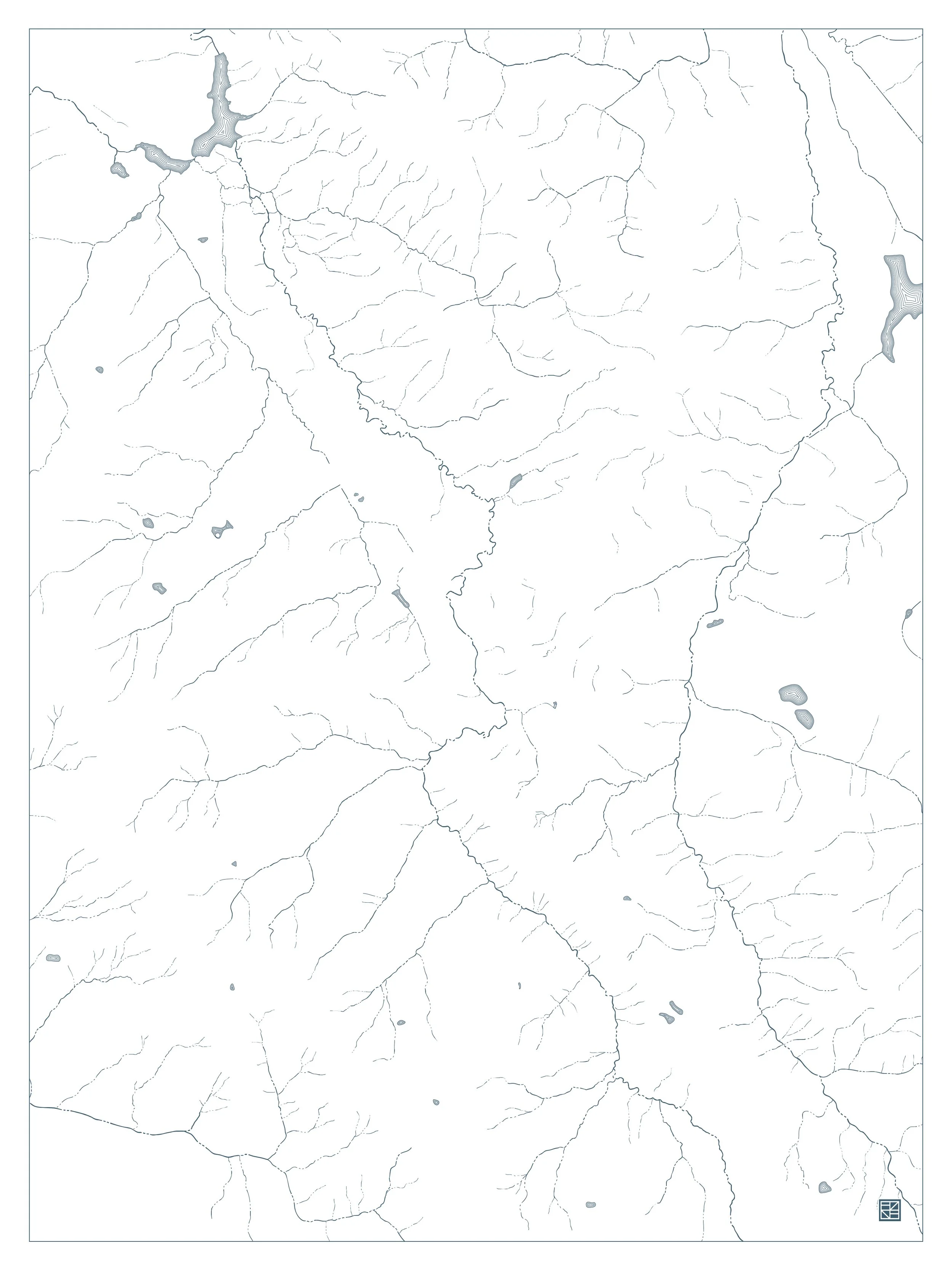 Each gully and meander was hand traced over USGS lidar surveys, slope maps, and aerial photography. This map shows how water flows across the landscape with truly unprecedented fidelity. Lakes and ponds are shaded with classic waterlines.